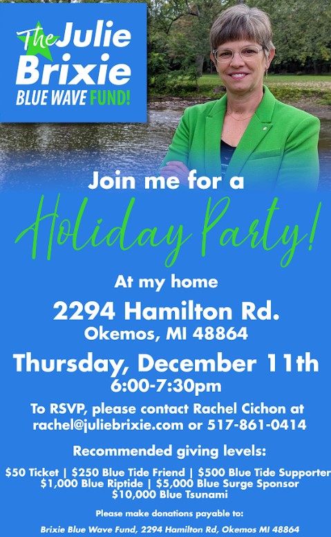 December UpdateFriends, As I wrap up Thanksgiving Weekend, I am so grateful to the many people who are making ICDP a stronger organization that is building coalitions and supporting our partners, as it is our patriotic duty to challenge authoritarianism and corporate greed. Thanks to so many of you for volunteering, for your generous donations, for your attendance at meetings and events, and for stepping up to be precinct delegates. I am thankful for our sisters and brothers who lead our other County parties within the 7th Congressional District, as we are coordinating and supporting one another. In that spirit, we are holding our annual Holiday Party at the Ingham County Human Services Building because we need a bigger space so that all Democratic Candidates for the 2026 election cycle, and those collecting petition signatures, to have a spot around the large room for easy circulation, and we still have space to eat and mingle. We hope you can join us, even for a quick visit, as we give thanks for the work we have done this year and get inspired to double our efforts in 2026 to do our part in providing strong leaders in Washington, DC, Lansing, and on school boards across the County. We can't do the work without your financial support, so please support our party building activities at: https://inghamdems.nationbuilder.com/donate Or mail a check made out to Ingham County Democratic Party to: PO Box 14333, Lansing, MI 48901 Brian P Jackson